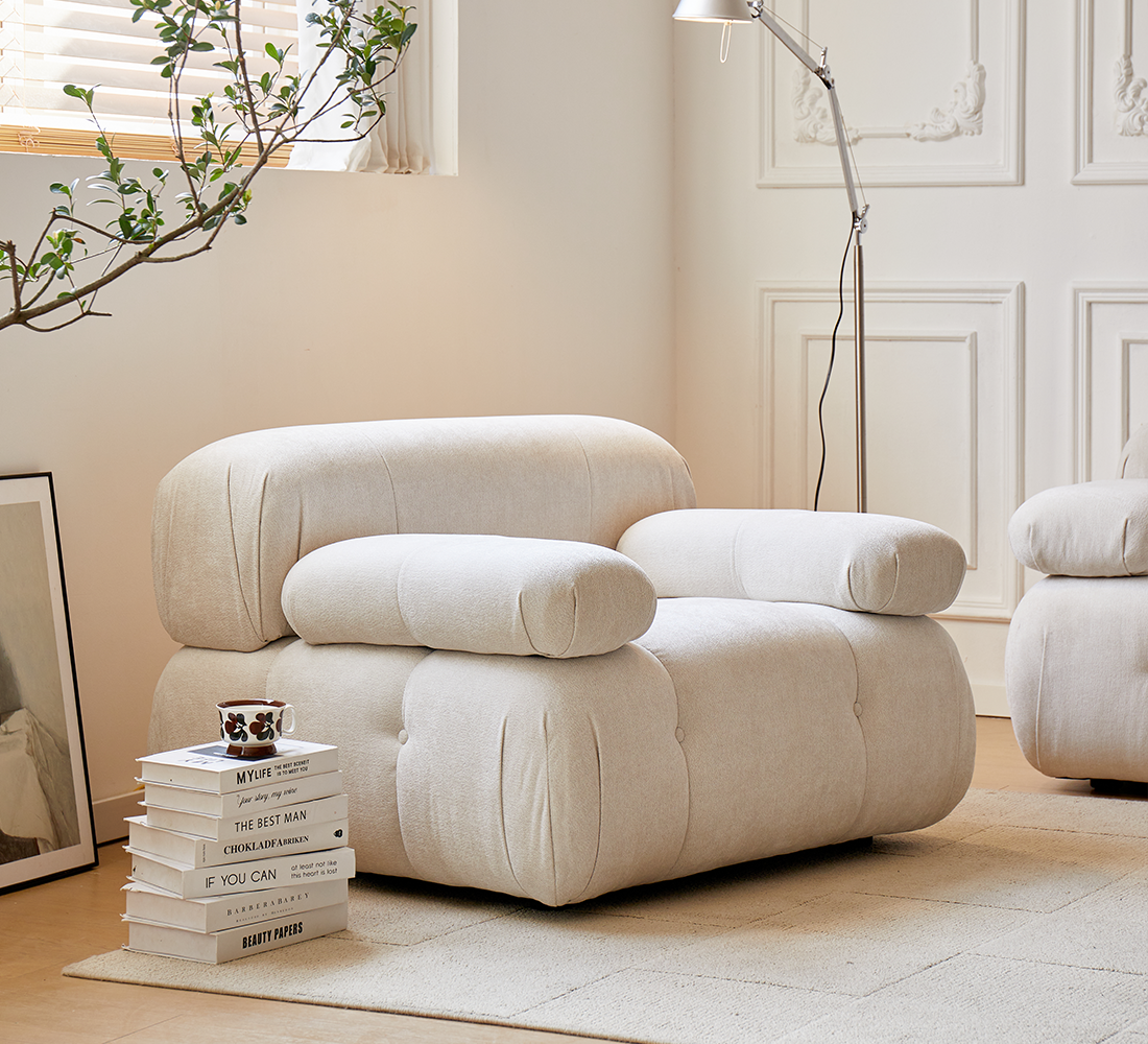 This cloud sofa oozes laid-back coziness. Clad in soft light beige fabric, it has a plump, rounded silhouette—its pleated modules look like squished fluffy cotton balls. With a curvy backrest and pillowy armrests (every line a gentle, squishy curve), lean in and sink right into that fluffy softness.